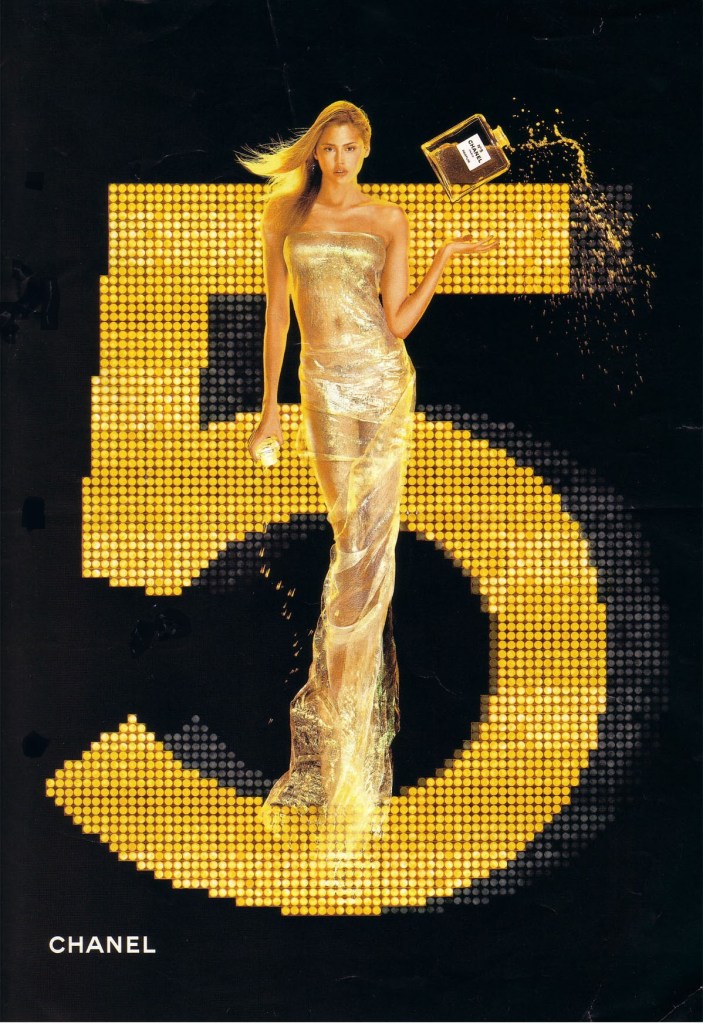 She is posed in a way that attract connotations of a mermaid. Ostensibly, the ad undertakes to represent visually the concept of “perfume.” Not an easy task, but it does that by mixing the images of gold, money and the perfume itself. The bottle doesn’t drop and crash, but seems to hang suspended in the air, or in liquid. It’s a different, higher universe, a mythical one.