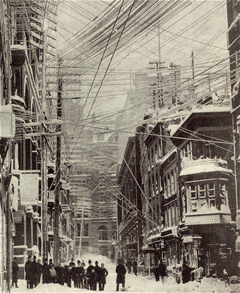 The shops are all closed, even the drug stores. There are no passing vehicles, no struggling pedestrians. The traffic of the great city has been annihilated by this prodigious storm. Telegraph wires, that last night were overhead, have many of them fallen. There is nothing for me but to struggle onward.