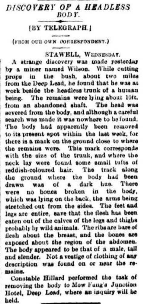 In 1882, a naked, headless corpse was found at a desolate spot in the bush near the Deep Lead goldmine, close to Stawell in the Wimmera Region of Victoria. Stawell is an important historical town in the state’s western development. The body was taken to the Junction Hotel at Deep Lead, a business owned by the Chinese immigrant Mow Fung, where it was kept for the police inquiry.