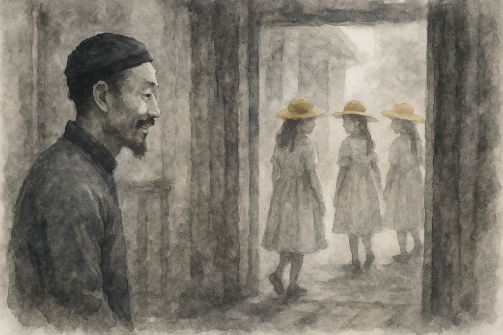 He met Huish-Huish coming in from the laundry with an armful of towels, their youngest daughter Alice trailing on her skirts. At that moment, the other daughters trooped down the staircase, Lena – the eldest at twelve years – herding her siblings. School uniforms and wide-brimmed straw hats floated in a bubble of chatter, expressing such immediate and minute issues as are memorialized perhaps in the record of human souls, but seldom if ever recalled in human life. “Hurry now,” Huish‑Huish called. Alice was moaning about the porridge. Lena hesitated at the threshold as the others spilled outside, her hand lingering on the doorframe.
