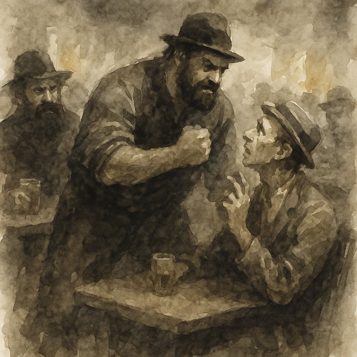 At some point, a mob of navvies crowd round the old farmers and begin to ply them with whisky for sport. Taking a barrel or chair for a seat, the hands share the one table, while one or two stand leaning against the wall engaged in their own conversations.